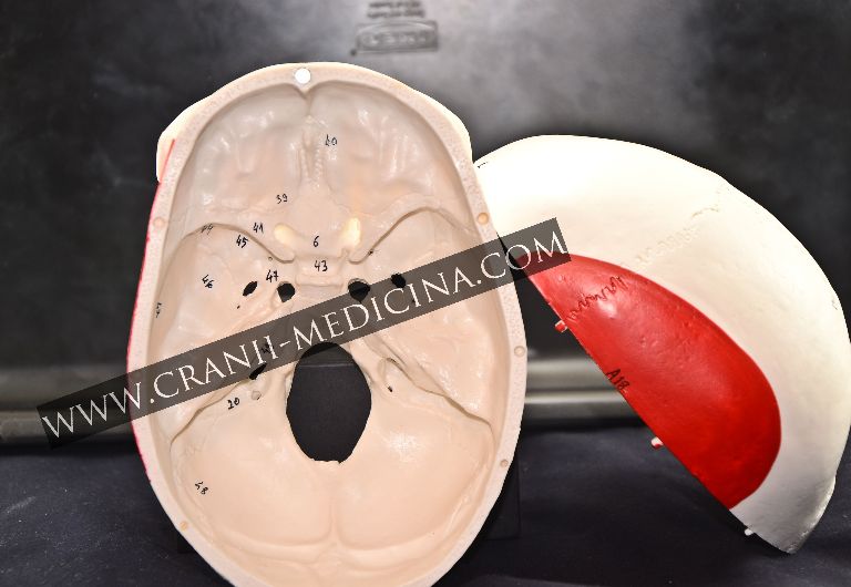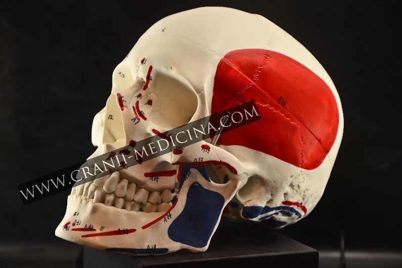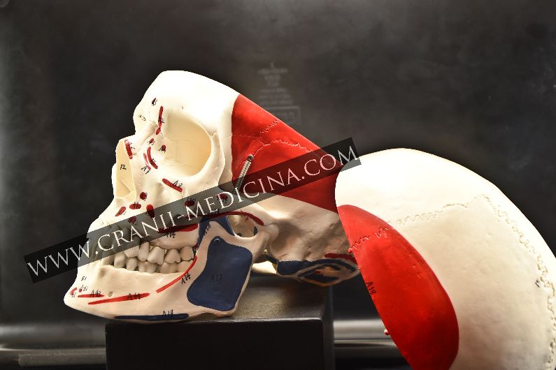 - Modelul de mulaj didactic craniu cu insertii musculare numerotat este de culoare alb-bej, reproduce aspectul natural al oaselor craniului uman. Acest model are zonele de atasare a muschilor colorate diferit, pentru a evidentia mai bine structurile musculare.