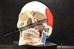 Mulaj didactic craniu cu insertii musculare numerotat – model de craniu cu insertii musculare in marime naturala cu 55 de repere anatomice, inscriptionat si etichetat cu denumirile structurilor anatomice ale craniului uman si muschii faciali.